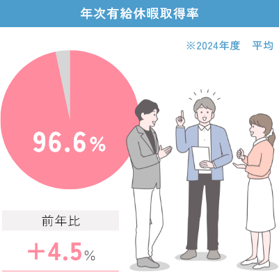 こうした取組の継続により、当社全体の年次有給休暇の取得率は90%を超える高い水準を維持しています。また、年次有給休暇と休日を組み合わせて連続休暇を取得することや、お子さまと一緒に「県民の日学校ホリデー」や「ラーケーションの日」に年次有給休暇を取得することも奨励しています。