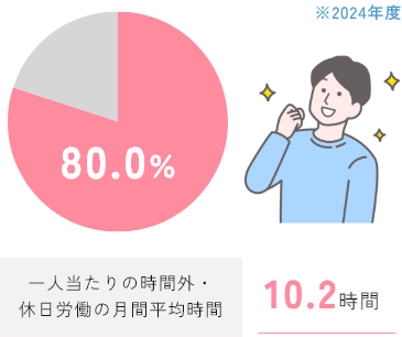 2024年度は年次有給休暇取得率80.0%、一人当たりの時間外・休日労働の月間平均時間は10.2時間でした。